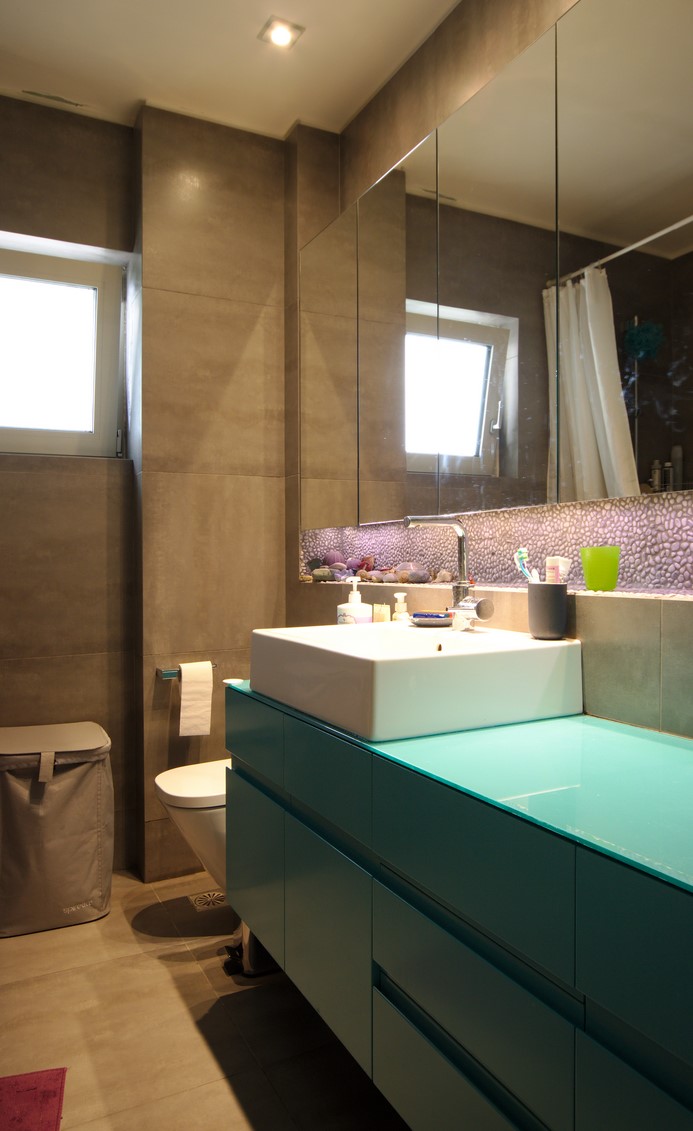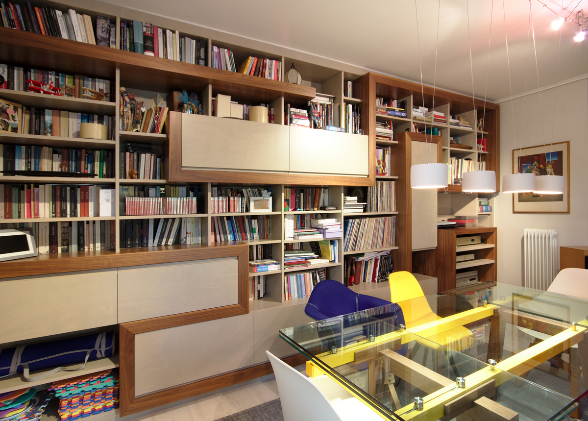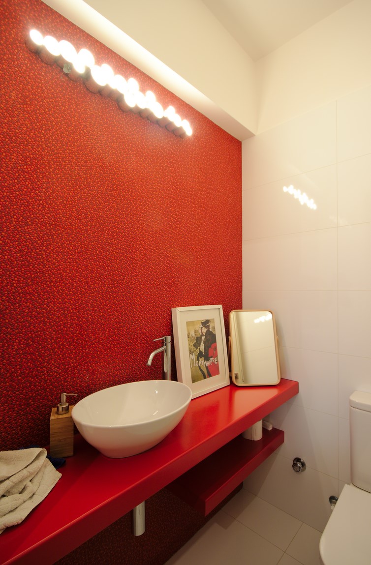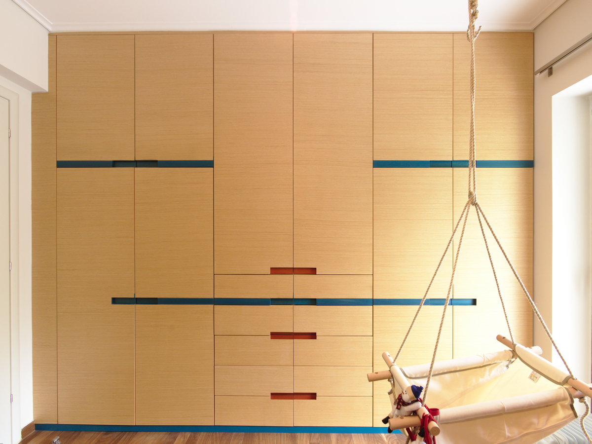 The couple decided to renovate the space according to their own aesthetics and needs. We concluded in replacing the kitchen furniture and the wardrobes of the three bedrooms, where the bathroom and WC were fully reconstructed. Part of the project were also the lighting design of specific spaces of the flat and the colourations of the rooms. A new bookcase was designed and constructed in the living room, a little while after the flat was inhabited.’.