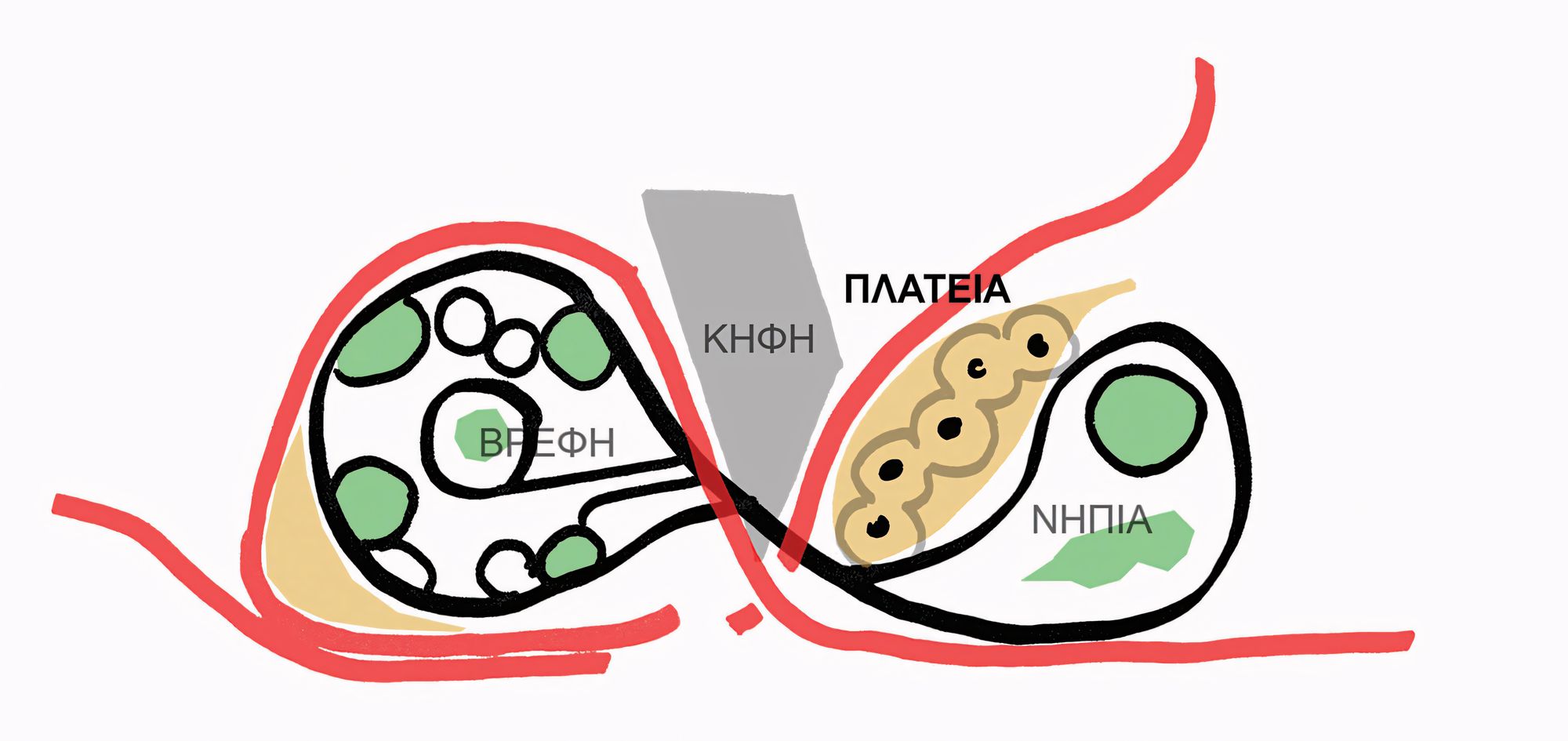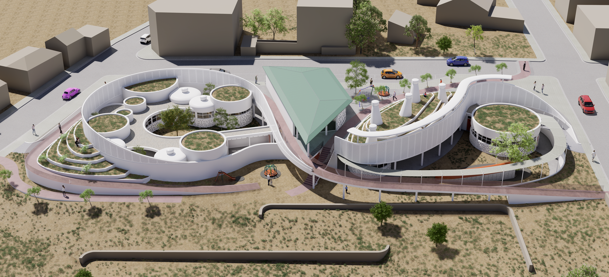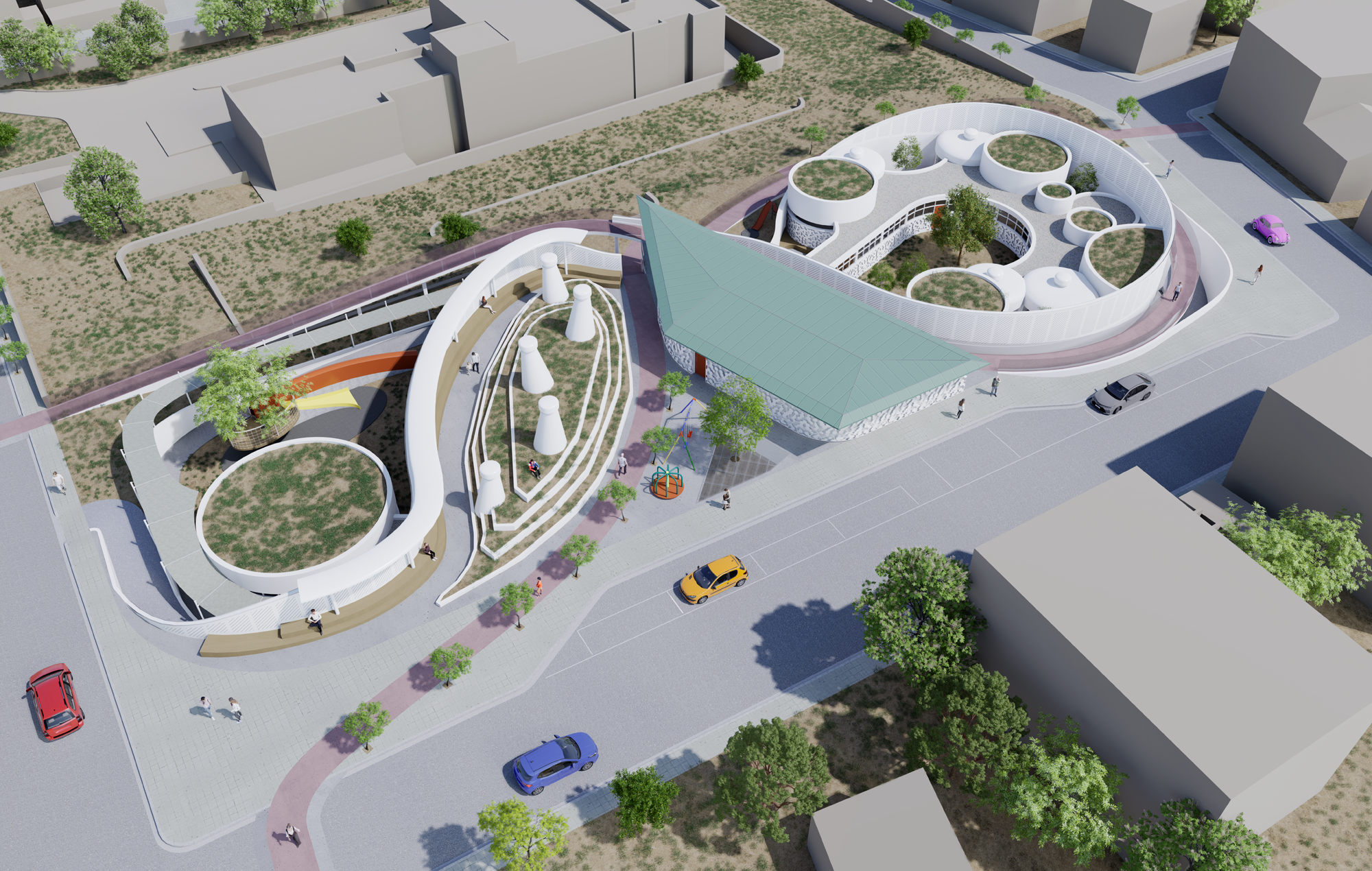 The functional units are organized around two courtyards. Their positions and their shape determine the organization and positions of all the individual units and functions. One courtyard refers to the infants and one to the toddlers of the nursery. Curved paths organize the movements, both in the exterior and interior space. The activity rooms are organized in circular shapes, with vaulted roofs. This shape, combined with their low location near the ground, intensifies the sense of security and intimacy for children, in analogy to the experience of hugging and the memory of the womb. Above the roof of the nursery there is an outdoor seating area and an artificial hill, in relation to the day care area for the elderly. The entire design, with the proposed routes and the complexity of the individual spaces, creates conditions for multiple, unconventional spatial experiences, transitions and alternations..
