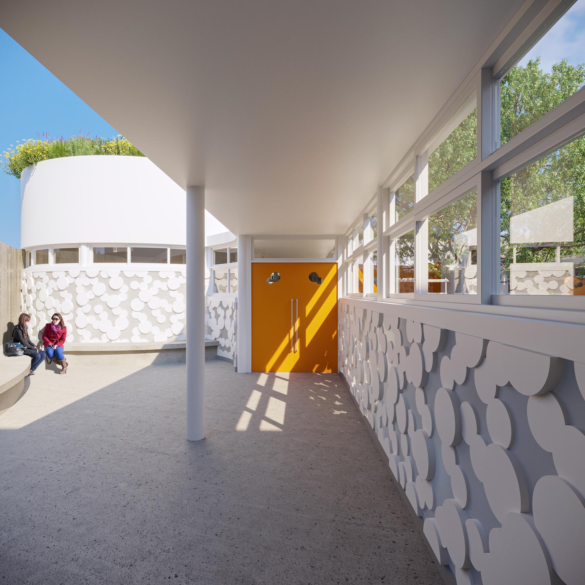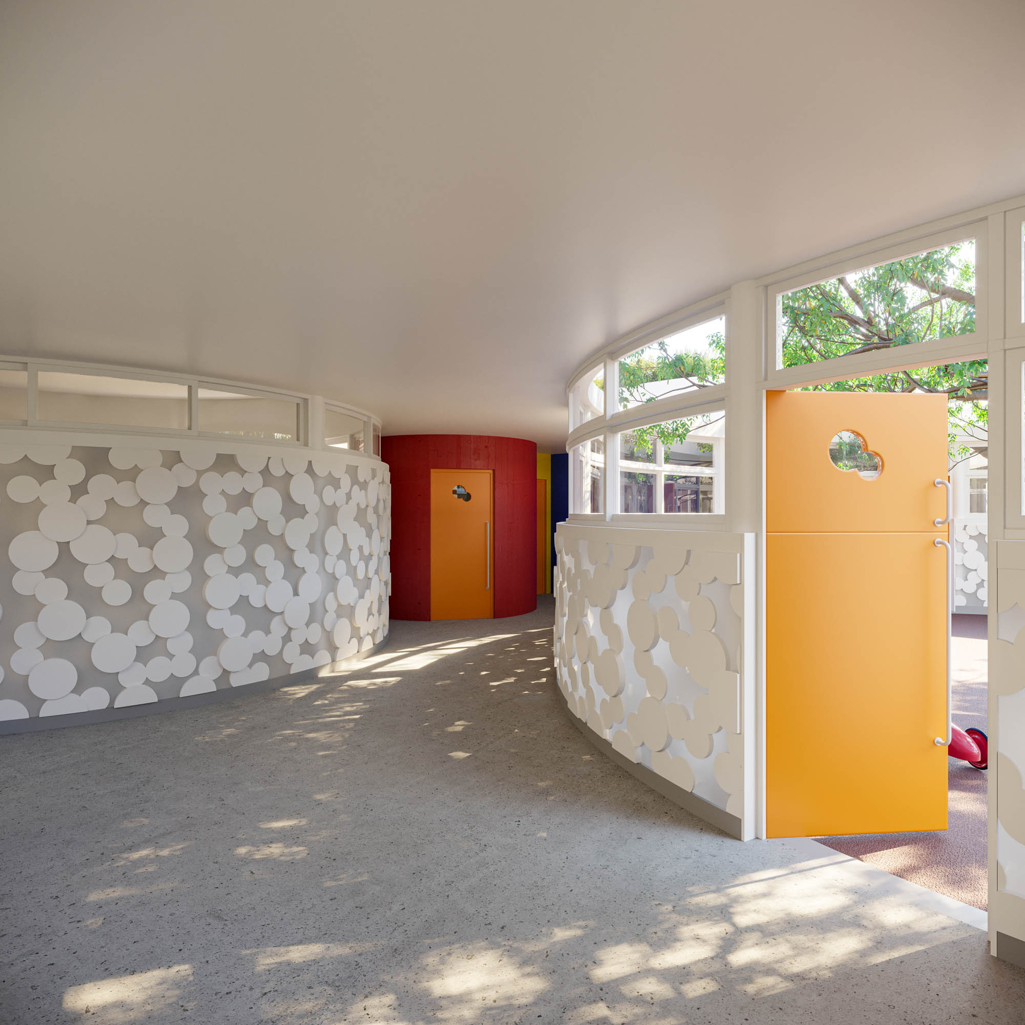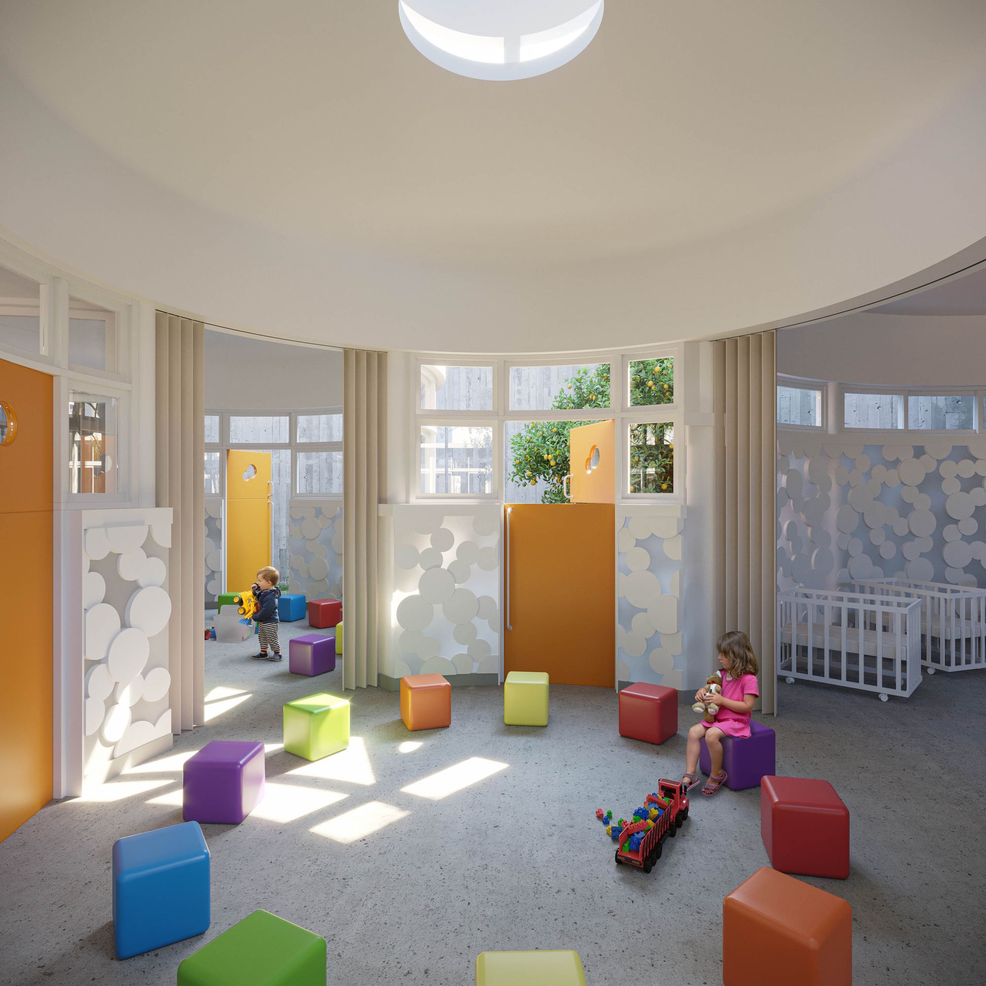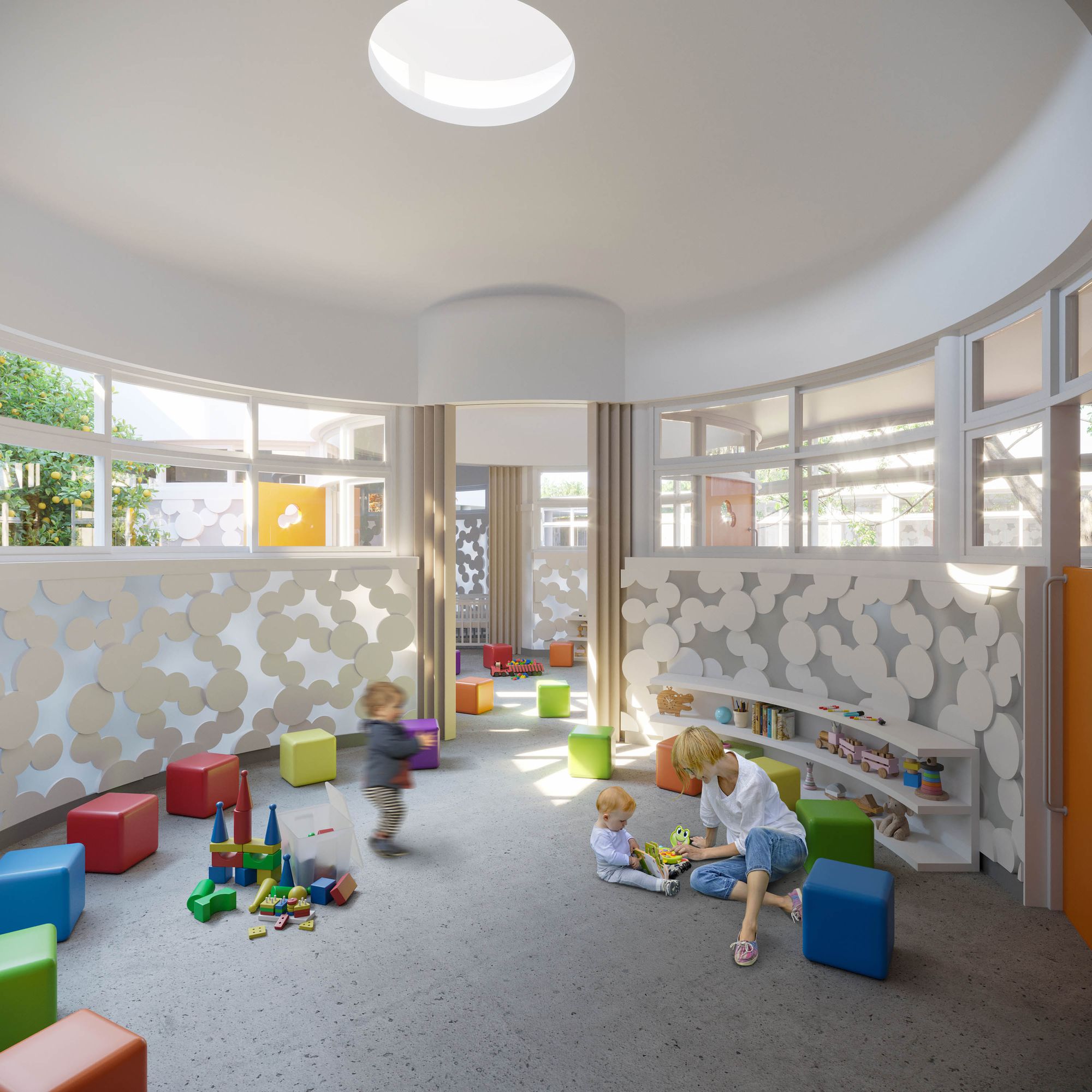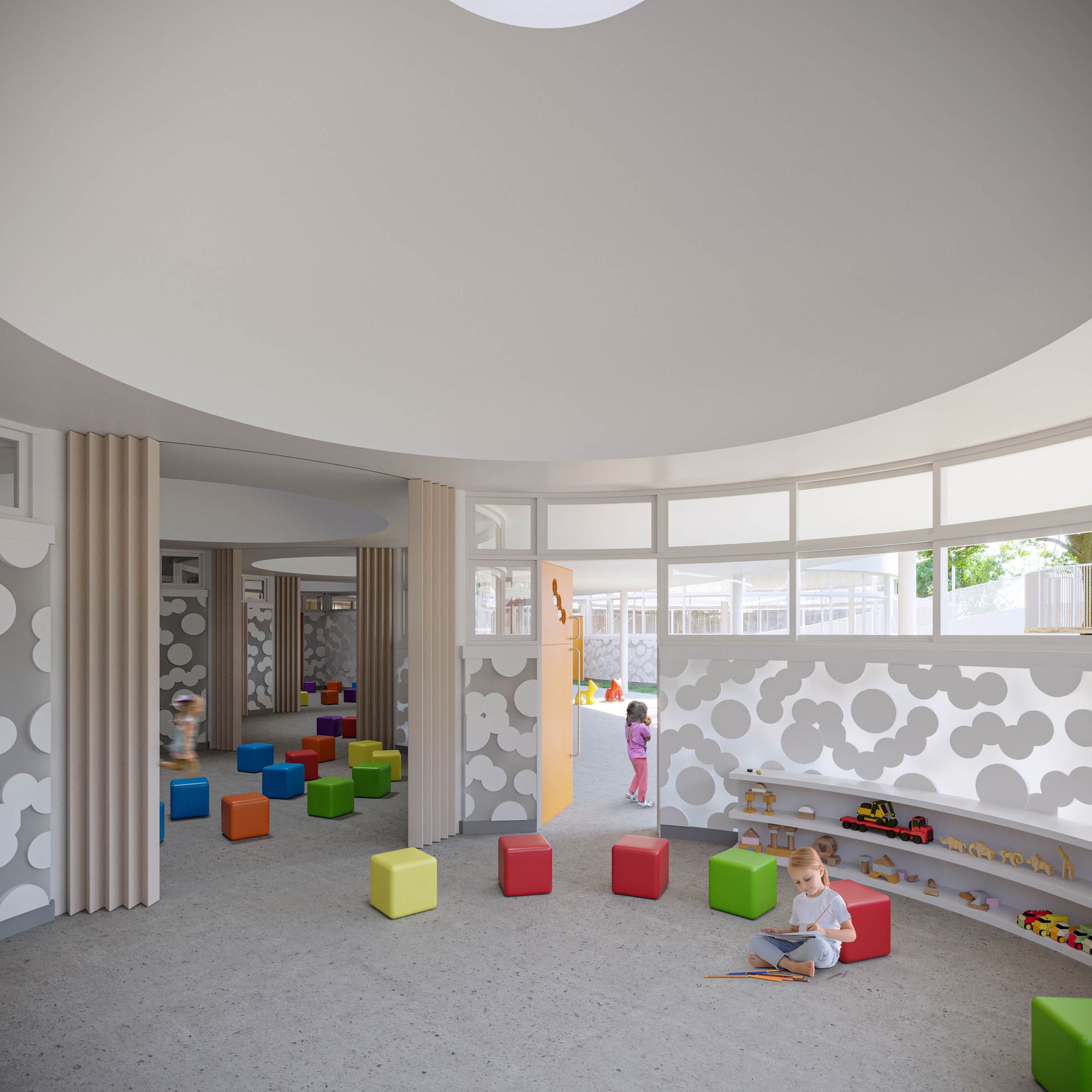 Επίσης, μέσω του σχεδιασμού, εξετάζεται το ζήτημα της παιδαγωγικής, προτείνοντας μία ισότιμη παρουσία στο χώρο των επιμέρους ρόλων του παιδαγωγού και του εκπαιδευόμενου, εκφρασμένη μέσα από κυκλικές διατάξεις αιθουσών, οι οποίες πλαισιώνουν και υπογραμμίζουν τις ομαδικές δραστηριότητες των παιδιών. Οι αίθουσες έχουν τη δυνατότητα ενοποίησης μεταξύ τους, δημιουργώντας προϋποθέσεις για μεγαλύτερη διάδραση στο χώρο, καθώς και δυνατότητα κλιμάκωσης των ομαδικών δραστηριοτήτων.