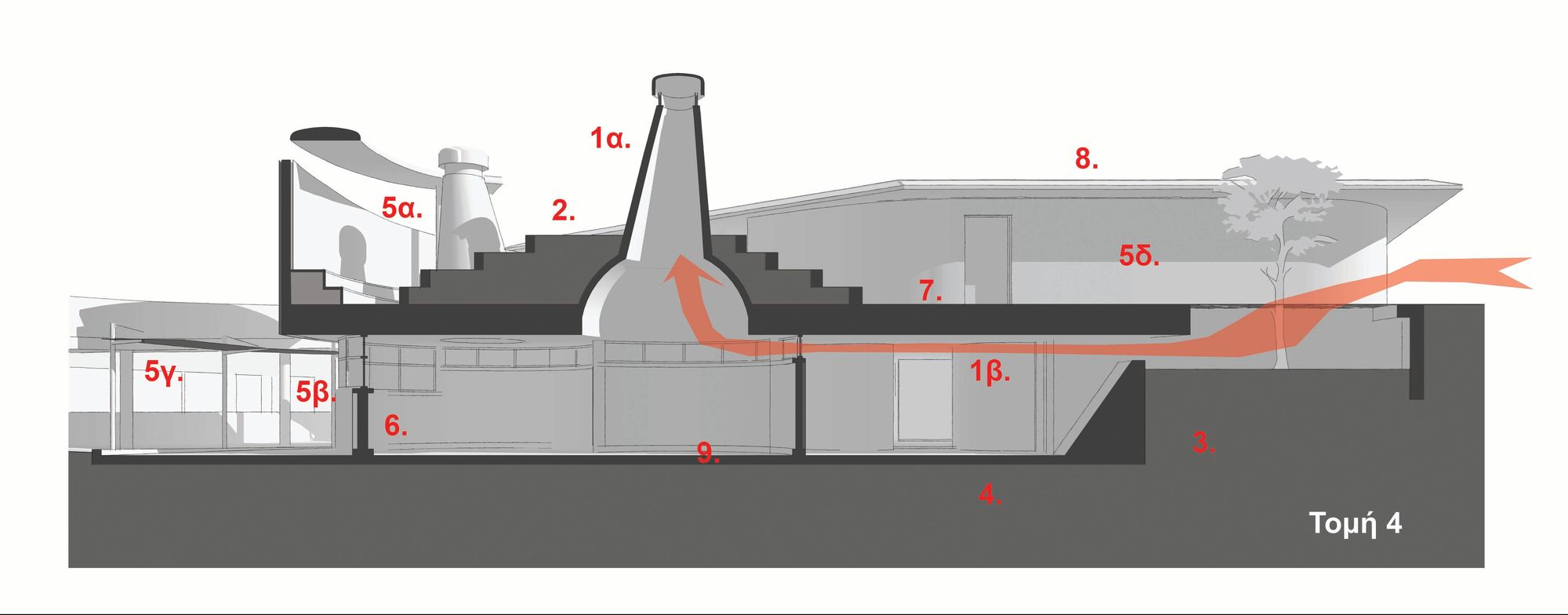 In relation to the bioclimatic design, it is proposed to exploit the thermal inertia of the ground with part of the building’s spaces being a cave, in combination with an artificial hill and a closed geothermal system. At the same time, natural ventilation systems with chimneys, zones of light, sunlight and shading, as well as other passive and active systems are proposed. All of the above individual bioclimatic systems and design elements, in addition to the overall energy benefit that will be brought to the operation of the individual spaces, can help the public understand how they operate and raise awareness regarding the issue of utilizing the energy available from the environment.