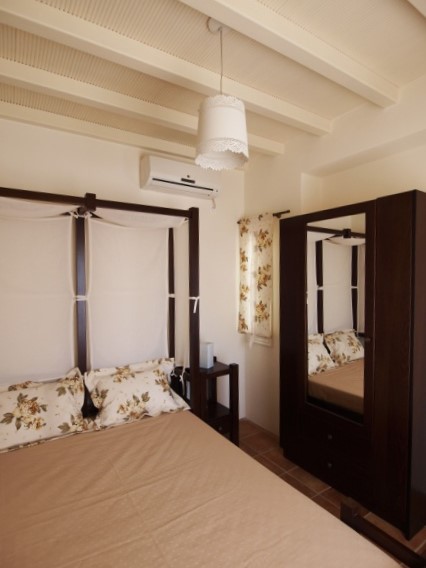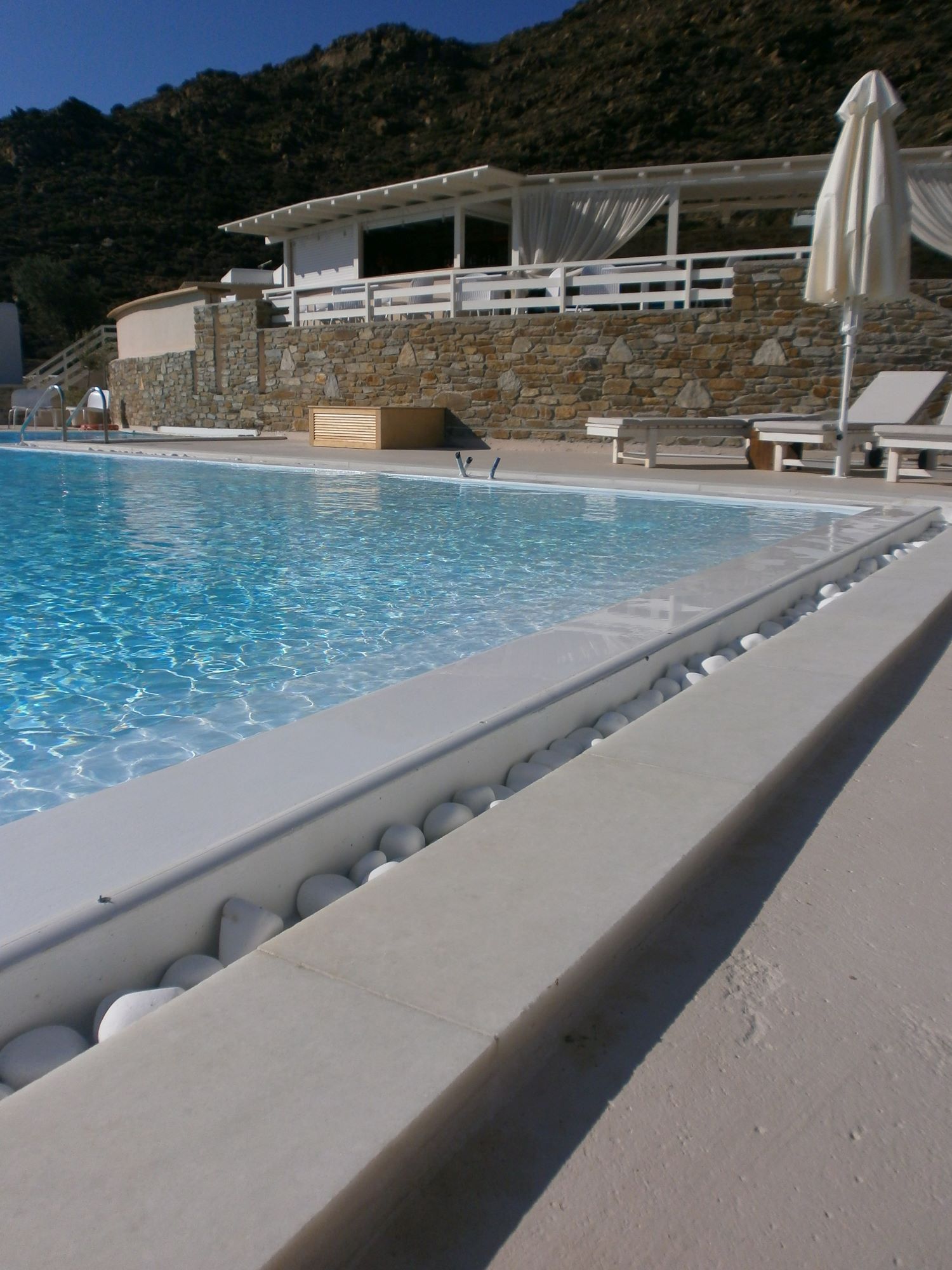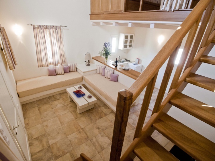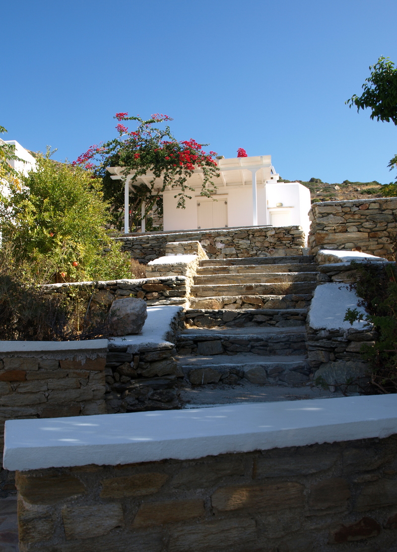 The owners, Petros and Popi Bourneli, wished to emphasise on the beauty of natural environment, the sense of relaxation and harmony, the importance of private space, the aesthetic quality. In result, we worked on the idea of small, independent studios, each of which unique, both in its interior and exterior space. The landscape was reformed to be the ‘spine’ of the complex. It connects the buildings and in the same time, it isolates them, creating private terraces with unhindered view. The swimming pool and the open bar are placed in a central area of the complex, in order to form a gathering space, the hotel’s public ‘plaza’.